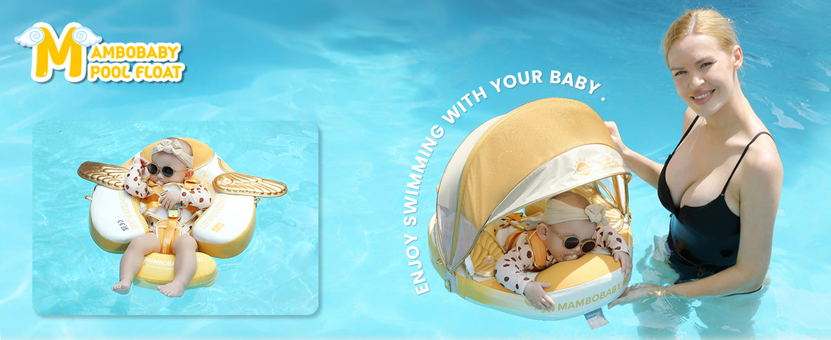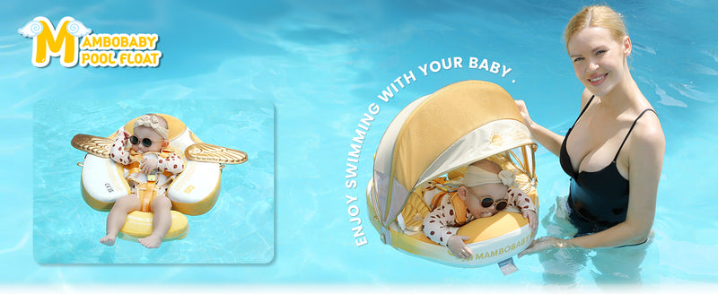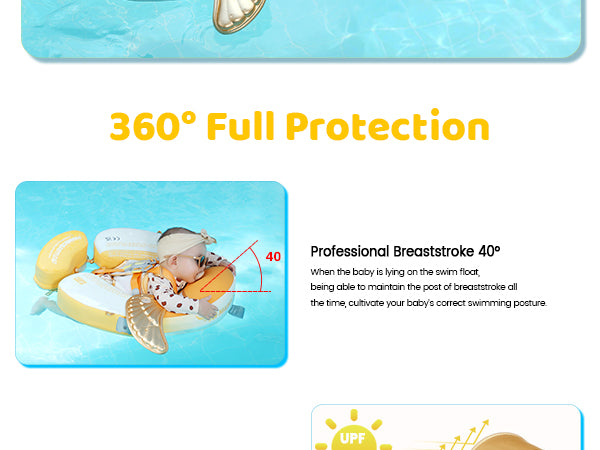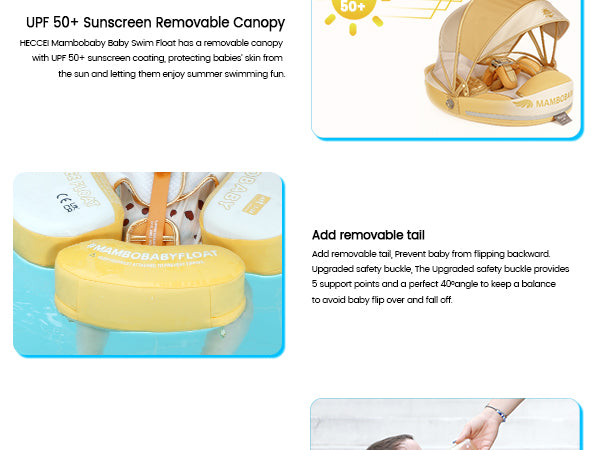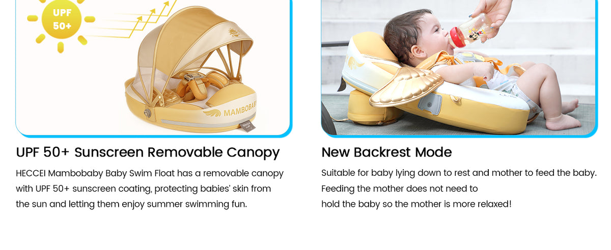 Mambobaby Baby Swim Float comes with a removable canopy. The removable assemble UV-PROOF canopy sun canopy covered with UPF 50+ sunscreen coating protects baby’s skin away from the sun. Make baby enjoy the swimming fun in summer.