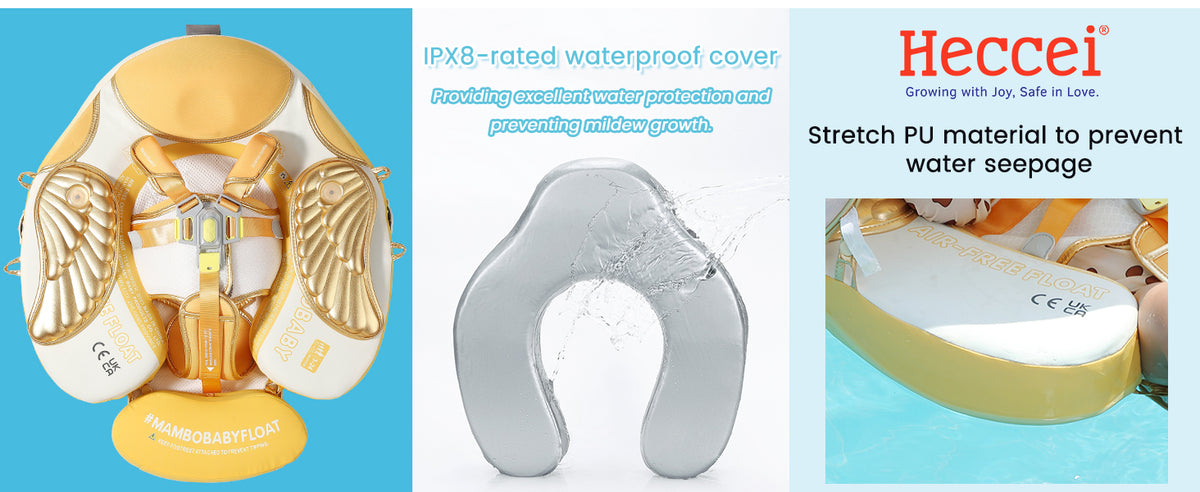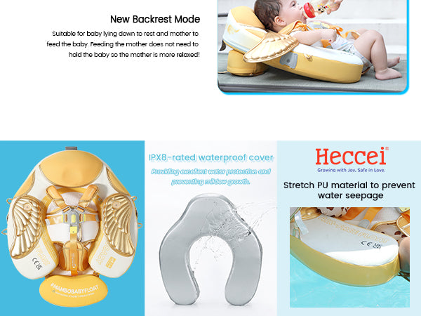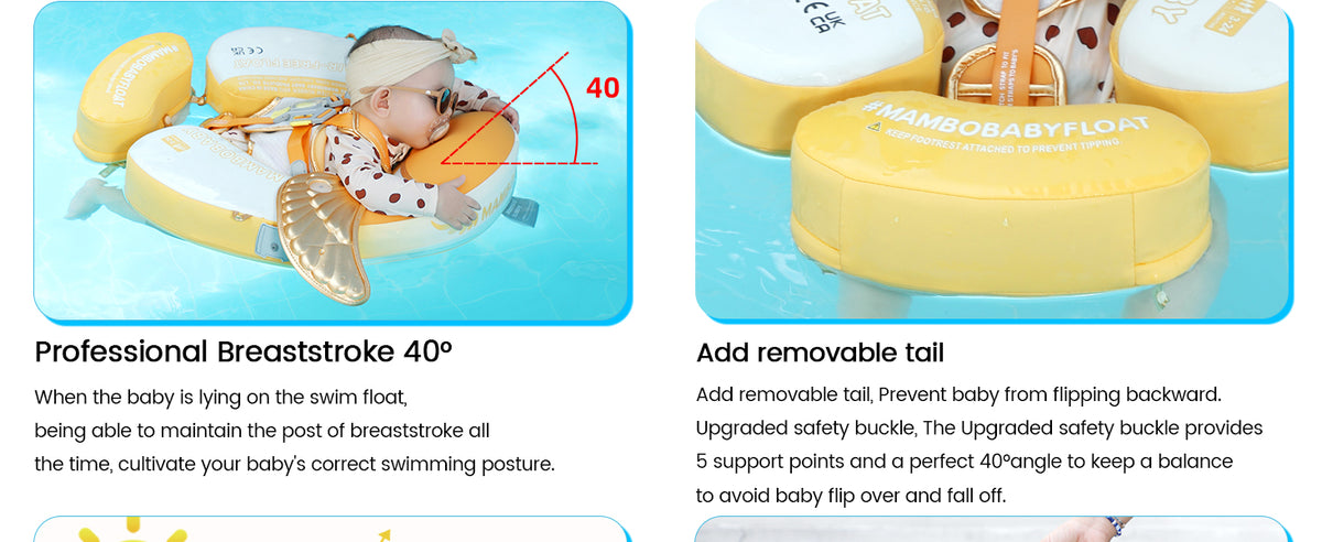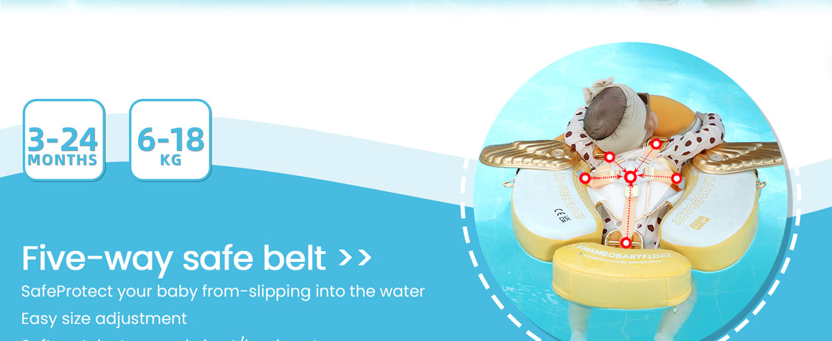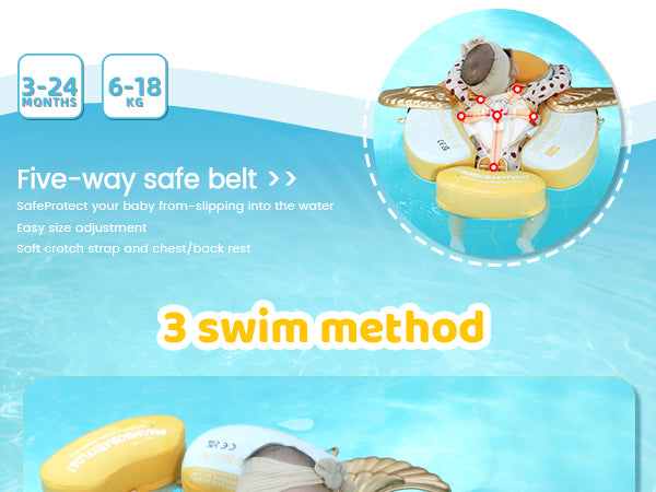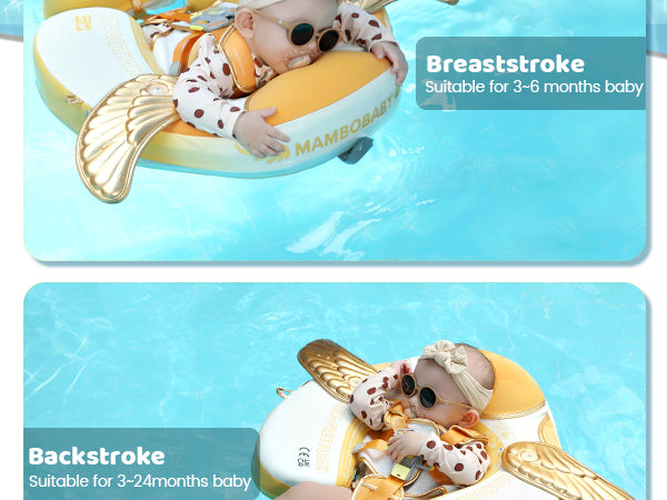 Upgraded into 3 swim ways which are backstroke, breaststroke and Floating Bed with different buckle method. Backstroke Suitable for 3~6months baby, breaststroke Suitable for 3~24months baby, Floating Bed Suitable for 3~6months baby.