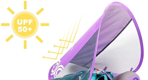 HECCEI Mambobaby Baby Swim Float comes with a removable canopy. The removable assemble UV-PROOF canopy sun canopy covered with UPF 50+ sunscreen coating protects baby’s skin away from the sun. Make baby enjoy the swimming fun in summer.