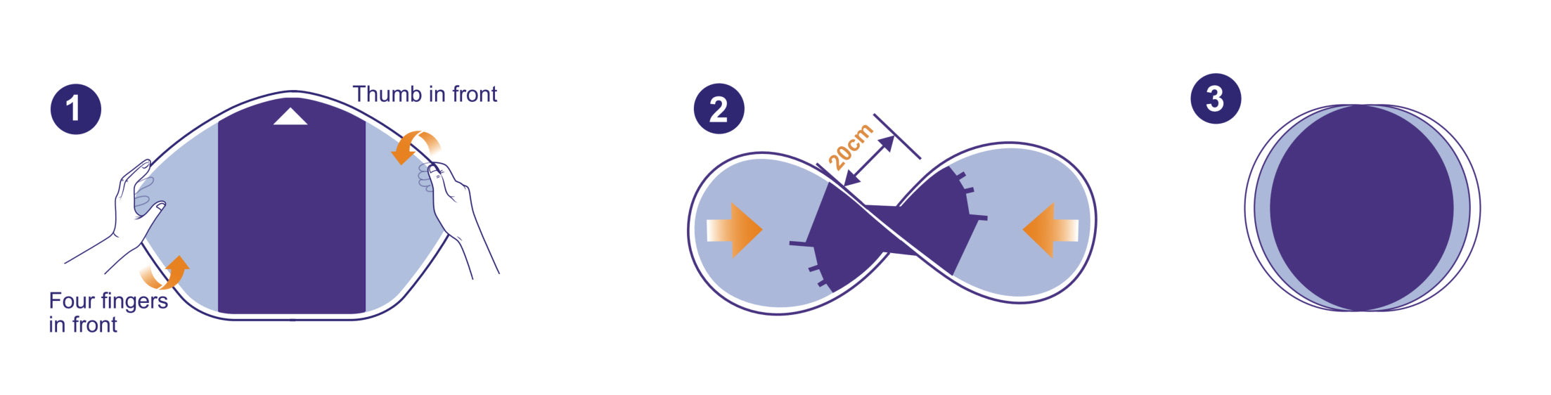 1.  lt is important to grip the edges of thecanopy with your fingers in the positionshown and twist it in the direction of the redarrow. 2. Do not snuggle after twisting it into afigure-8 shape.The distance betweenthe front and the back is around 20cm.Push your hands towards the middle. 3. Finally,pack the folded canopyinto a bag to prevent it frompopping open.