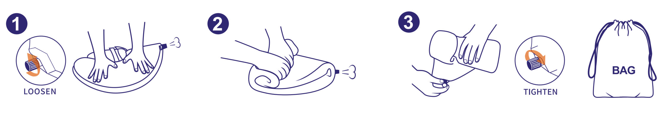 1. Please loosen the air nozzlecap. Fold the float in half. Rollit from the back side to theside of the nozzle slowly andsqueeze the gas out. 2. Fold the float in half. Roll itfrom the back side to the sideof the nozzle slowly andsqueeze the gas out. 3. Tighten the nozzle to prevent the gas fromentering.Keep the float in bags.