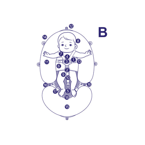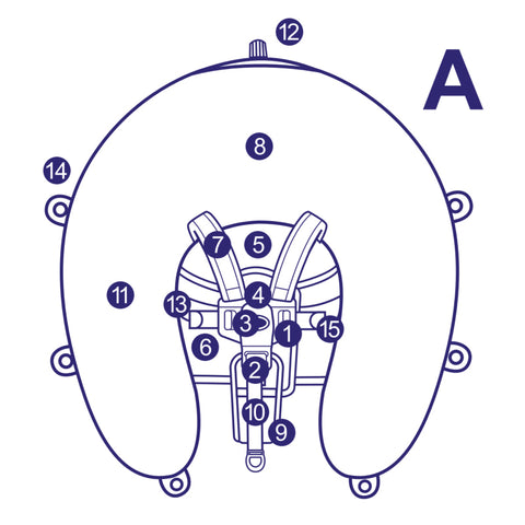 • Place your baby on its back on the chest/back rest(A-5) in the middle of the float and place the back ofthe baby's head in the nest of the headrest (A-8).