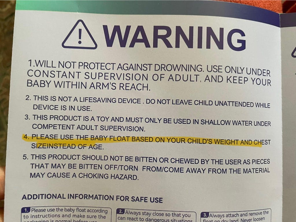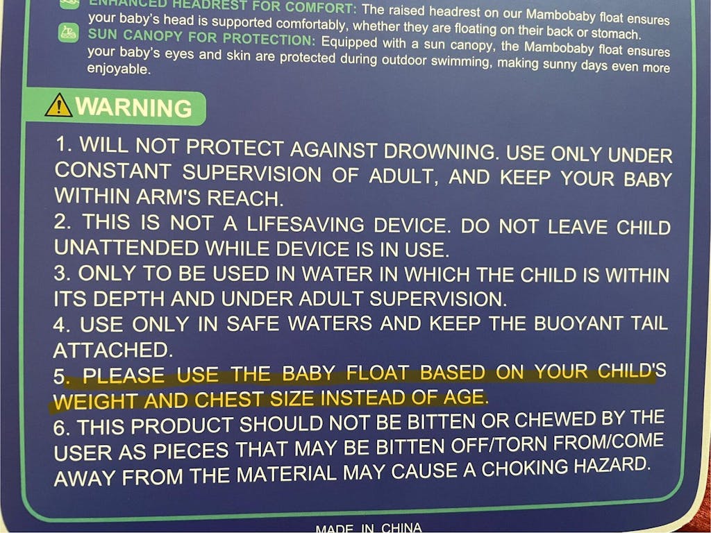 The buoyant tail must be installed during the entire process of using the float, and the backstroke position can only be used for babies less than 6 months. Pool floats are not a substitute for swimming lessons or life vests. DO USE IT UNDER THE ADULT'S CONSTANT SUPERVISION. NEVER LEAVE A CHILD IN A POOL FLOAT WITHOUT SUPERVISION.