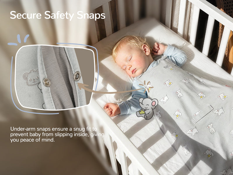 The design is very thoughtful and functional. The two-way zipper and feet-out option make diaper changes much easier, especially during nighttime changes. The shoulder snaps and under-arm snaps help create a secure and snug fit, and the center metal snap adds extra stability. I also really like that it includes harness slots, which makes it easy to move baby between a crib, stroller, or bouncer without removing the sleep sack.